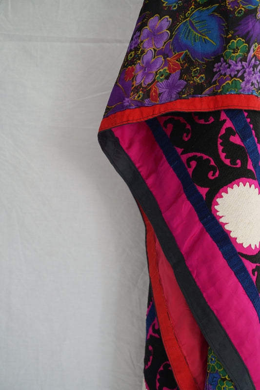 Vintage Suzani with Cotton Embroidery on a Silk/Satin Ground in Vibrant pink with Yellow